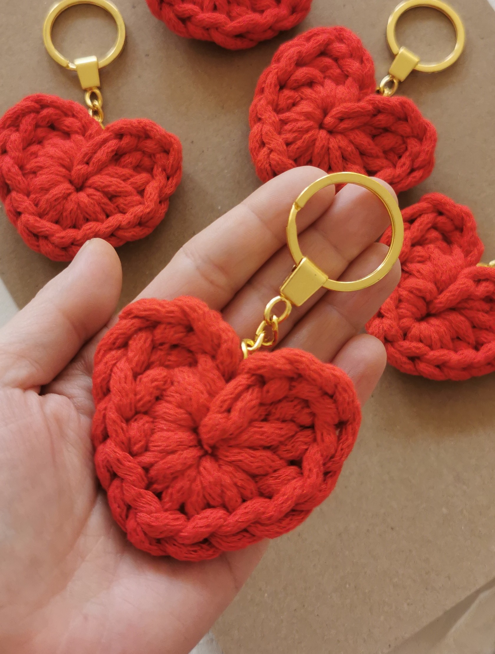 Brelok w kształcie serca, wykonany na szydełku ze sznurka bawełnianego.